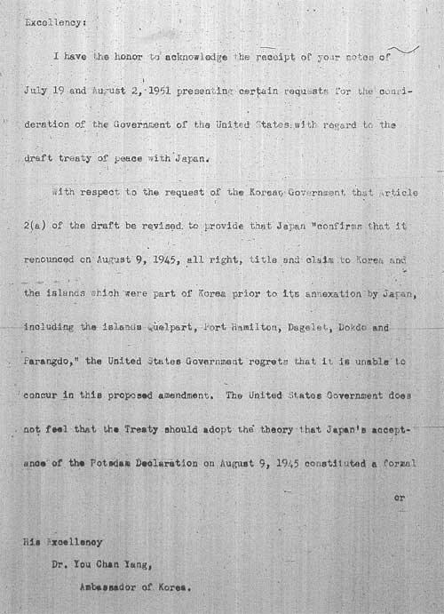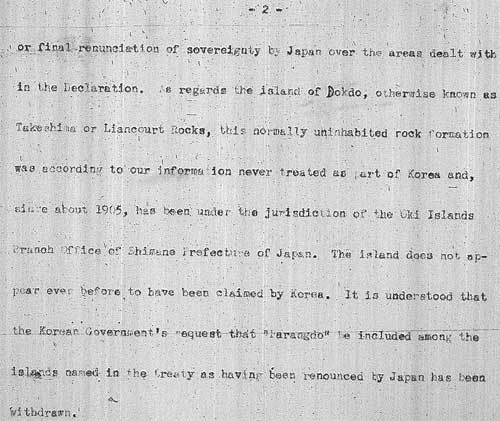 草案第2条(a)を日本が「朝鮮並びに済州島、巨文島、鬱陵島、ドク島及びパラン島を含む日本による朝鮮の併合前に朝鮮の一部であった島々に対するすべての権利、権原及び請求権を、1945年8月9日に放棄したことを確認する」と改訂するという韓国政府の要望に関しては、合衆国政府は、遺憾ながら当該提案にかかる修正に賛同することができません。